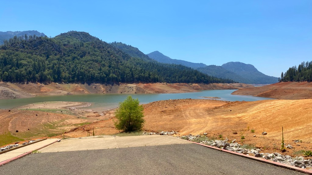 Climate change is driving extreme drought in the west. Many reservoirs were below 1/2 capacity. — Lake Shasta, California, July 2021.
