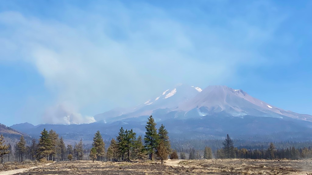 Mount Shasta, California, unusually snow depleted and ablaze — July 2021